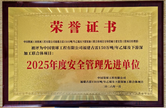 近日,公司承建的福(fú)建古雷150萬(wàn)噸/年(nián)乙烯及下(xià)遊深加工聯合體項目憑借出色的安全管理水平(píng),被授予 “2025 年度安全管理先進單位” 稱號並(bìng)收獲感謝(xiè)信,用實力為(wéi)項目打(dǎ)造全球能源化工中外(wài)合作標杆築牢根基。