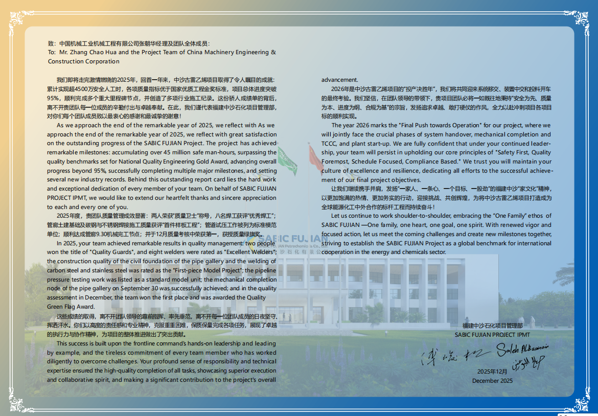 信中,福建中沙石化(huà)項目管理部肯定了公司在福建古雷項目2025 年(nián)的亮眼成績——管廊土建基礎及(jí)碳鋼與不鏽鋼焊接施(shī)工質量獲評“首件樣板工程”;管道試壓工作被列為標準模範單位;順利達成管廊9.30糖心破解完工節點,並於12月質量考核中榮(róng)獲第一,獲授質量綠旗(qí)獎。2026年是福建古雷項目的“投產決勝年”,公(gōng)司將持續公(gōng)司將繼續以高標準、嚴要求推進項目建設,堅守安全紅線,全力保障項目按期(qī)高(gāo)質量投產。