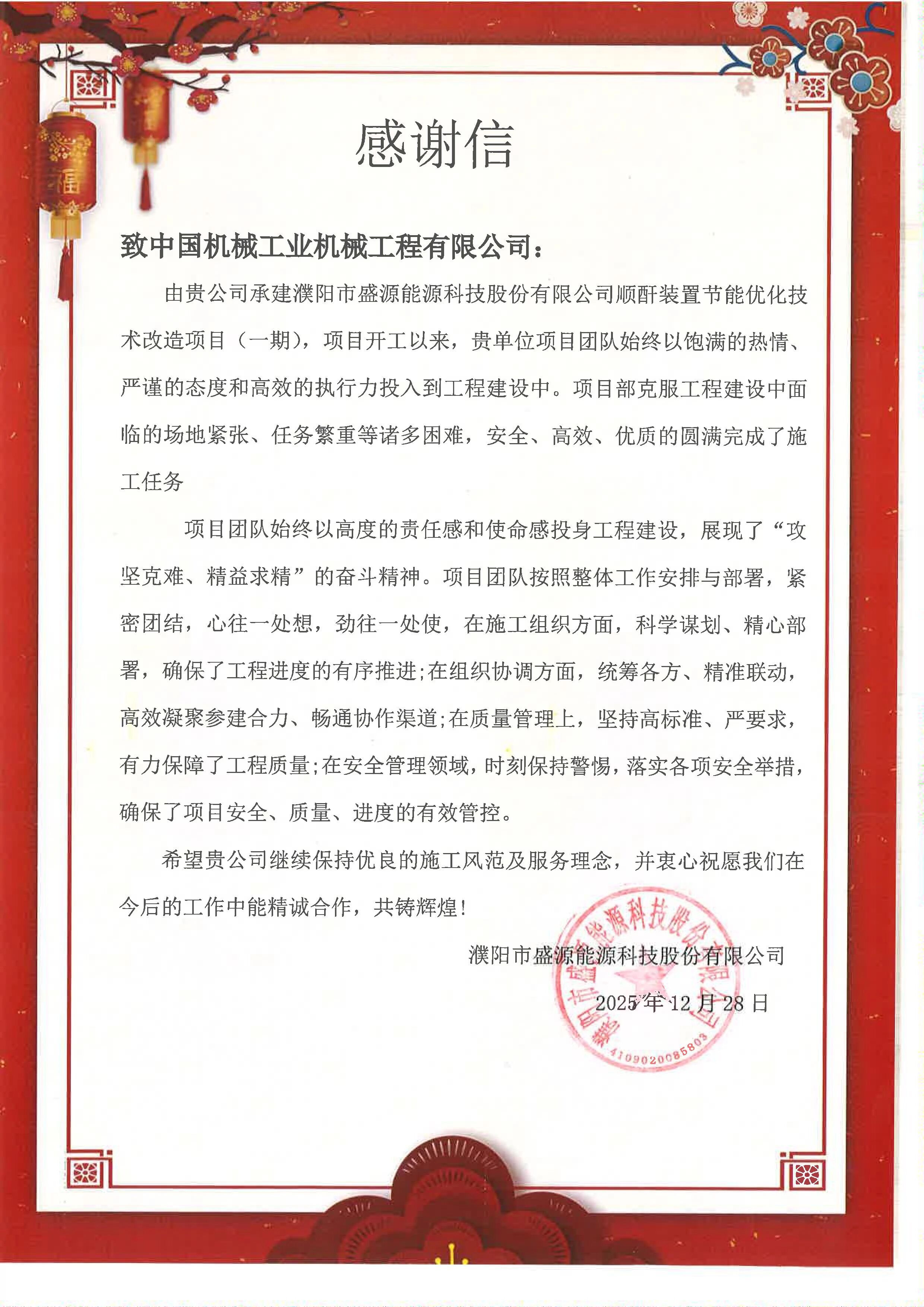 近日,公(gōng)司承建的濮陽市(shì)順酐裝置節能優化技術改造項目(一期)收獲感謝信(xìn)。信中,濮陽市盛源能源科技股份有限公司對公司及(jí)項目團隊圓滿完成施工任(rèn)務表示(shì)感謝(xiè)。