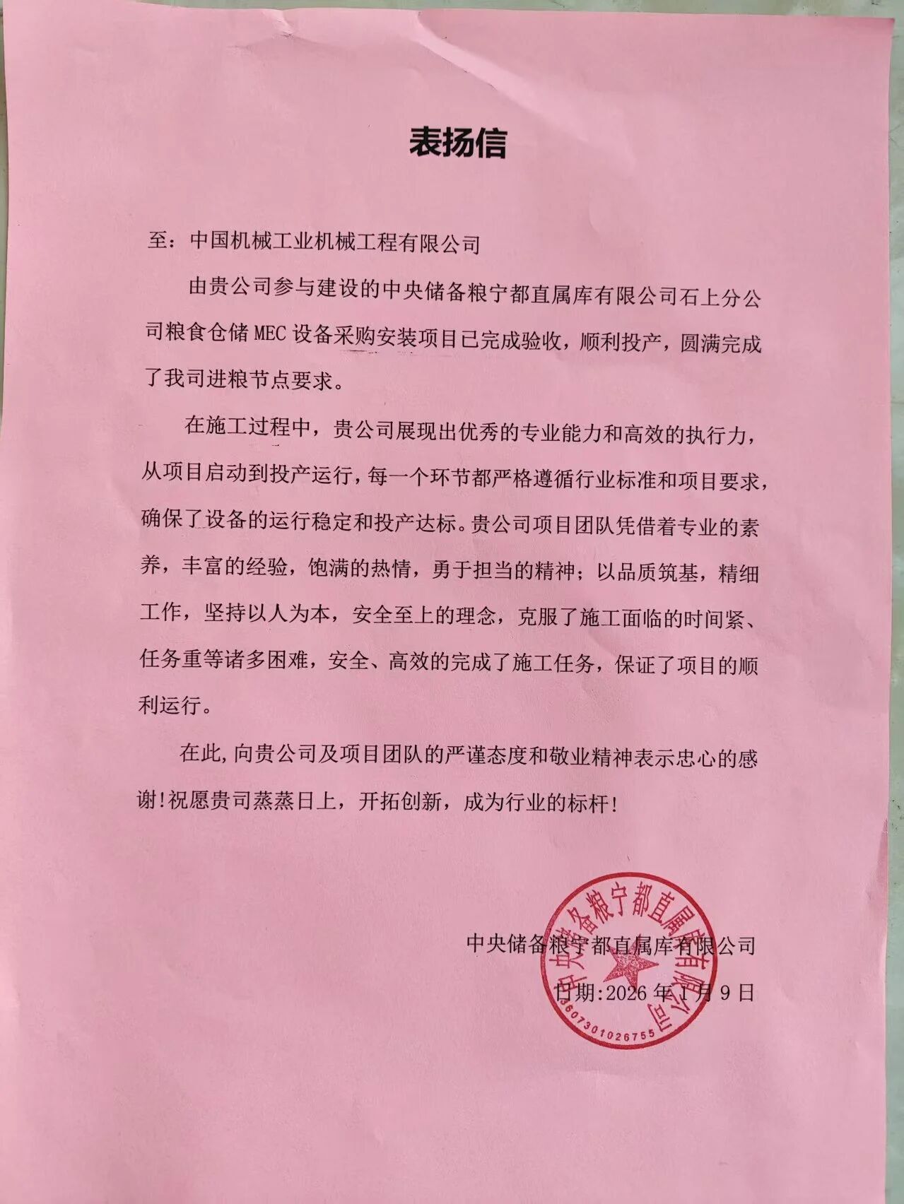 近日,公司收到中央儲(chǔ)備糧寧都直屬庫有限公(gōng)司發來的表揚(yáng)信,信中業主對公司在“中(zhōng)儲糧寧都直屬庫糧食倉(cāng)儲MEC設備采購安裝項目項目”中的嚴謹態度和敬業精神表示感謝。