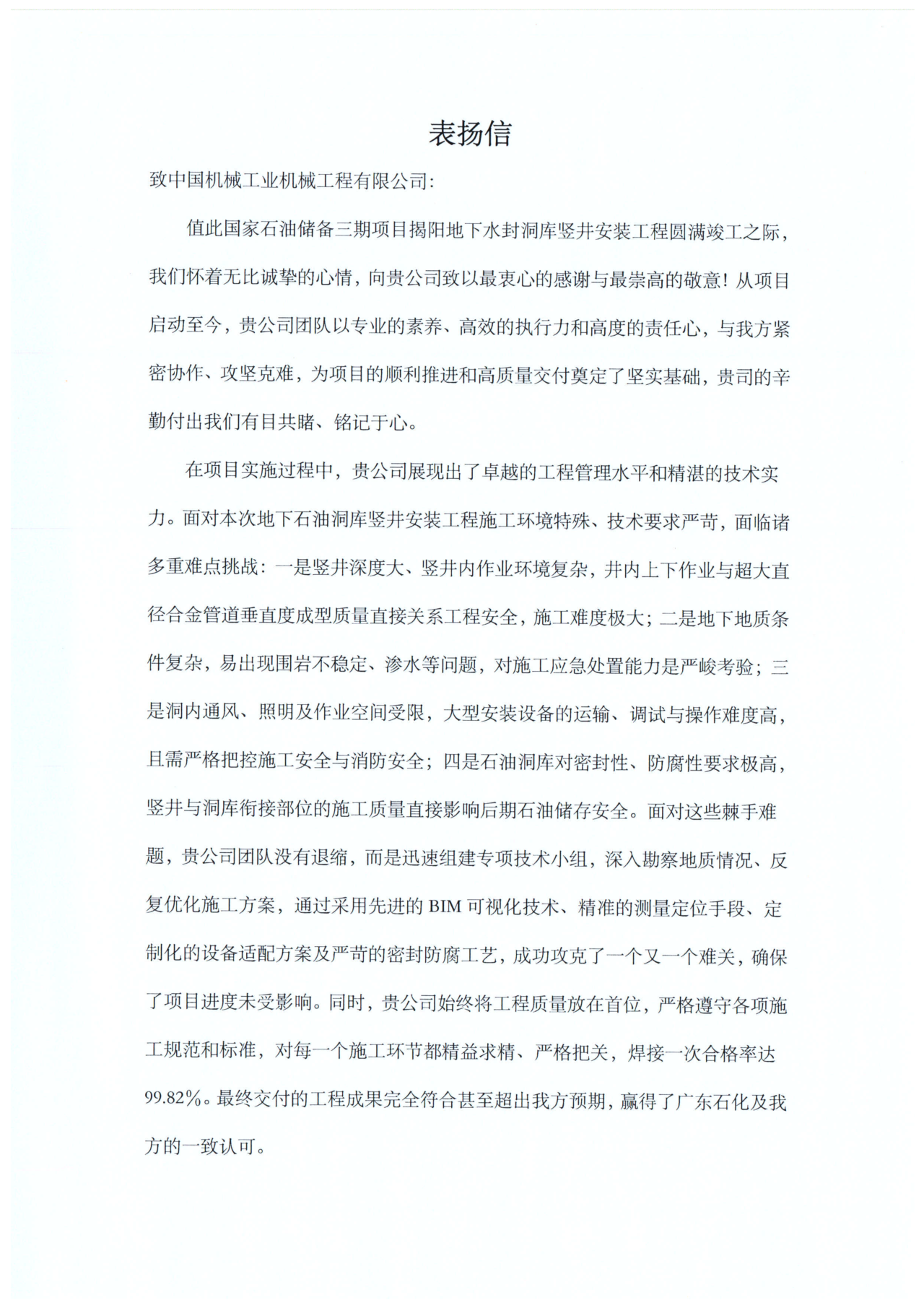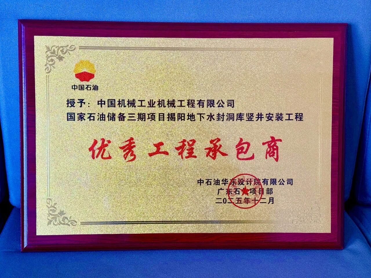 近日,中石油(yóu)華東設計院有限公司廣東石化項目部對(duì)公司承建的國家石油儲備(bèi)三期項目揭陽地下水封洞庫豎井安裝工程高度肯定,授予公司“優秀(xiù)工程承包商”稱號並發來表(biǎo)揚信。