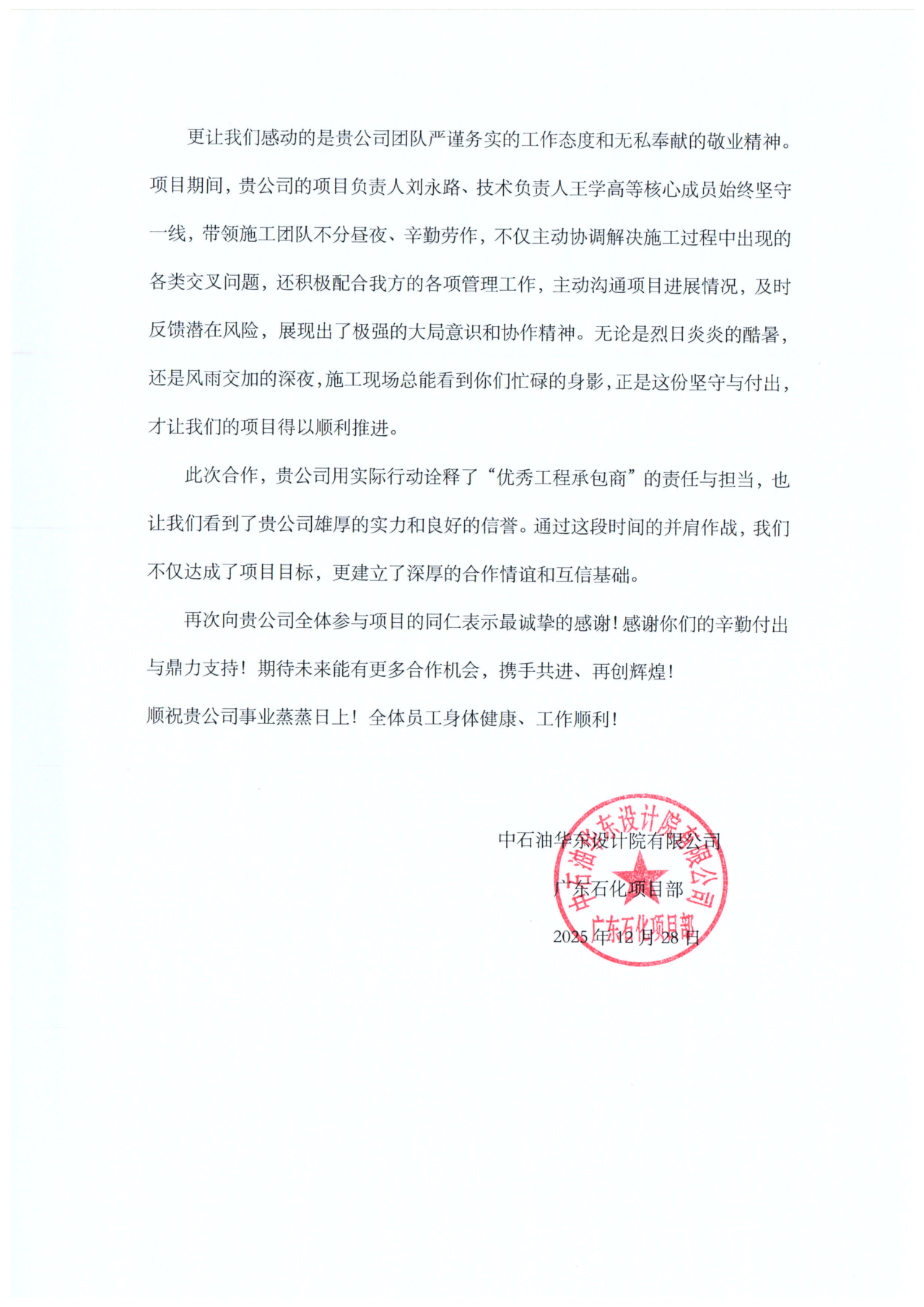 近日,公司接連收到來自(zì)福建中沙石化項(xiàng)目管理部、濮陽市盛源能源科技股份有限公司、中央儲備糧寧都直屬庫有限公司、中石油華東設計院有限公司廣東石化項目部等(děng)多家(jiā)單位的感謝(xiè)信與表揚信。